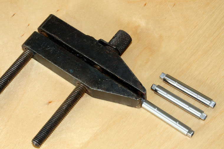 This seems a sensible place to start. In truth the axles only need 'modifying' not 'making'. The first step is to mark two holes through the axle. I normally do these about 8mm in from the back of the wheel but the actual length will depend on the size of the bearings and amount of sideplay in your chassis. The photo shows how the axle can be gripped in a (toolmaker's) clamp on the square end. If it's then put on a stable surface the position of the drill holes can be marked with a centre punch. At this stage it's a good idea to de-grease the axle with lighter fluid in preparation for cutting and gluing.