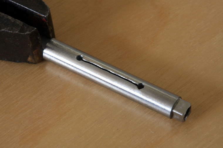 The next step is to drill the holes 1mm and run a slot between them with the saw. It's worth keeping the axle in the clamp until this stage is over, it will reduce the chance of breaking either the drill or saw blade. The holes and slot will need de-burring to reduce the chance of a stray piece of swarf bridging the insulation gap. The finished stage looks like the photo.