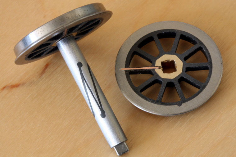 And this is a wheel finished. The end of the copper wire has been soldered into the slot in the back of the rim. After testing with a multi-meter the wheel can be de-greased with lighter fluid and the back of the slot filled with epoxy. Once the epoxy has set the excess wire can be cut off and the back of the wheel rubbed down on emery paper. I then blacken and polish the wheels; alternatively you may want to apply a thin coat of an oil to reduce the chance of tarnishing.