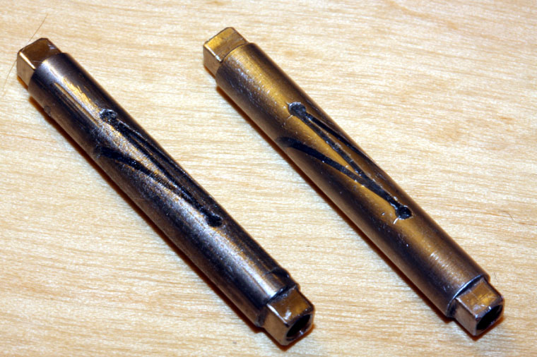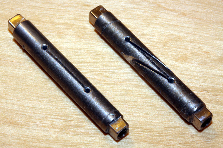 Unwrapping the tape from the axles should reveal an axle looking like the one on the left - covered in glue. Carefull scraping and polishing with fine emery paper will soon provide you with a smooth, shiny axle ready for use.
